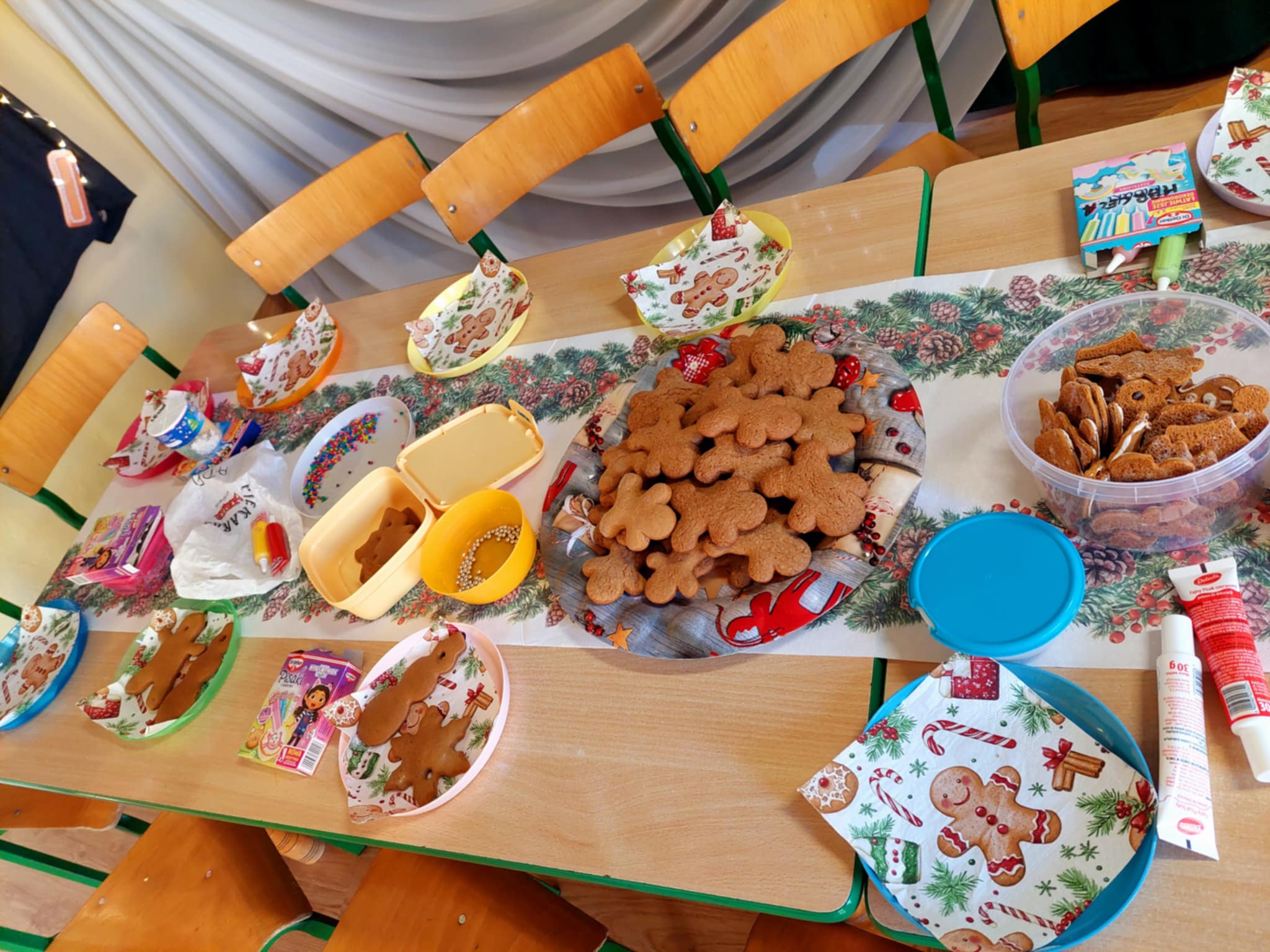 Na stołach pojawił się lukier, kolorowe posypki, pianki oraz cukrowe pisaki do ozdabiania upieczonych ciasteczek.